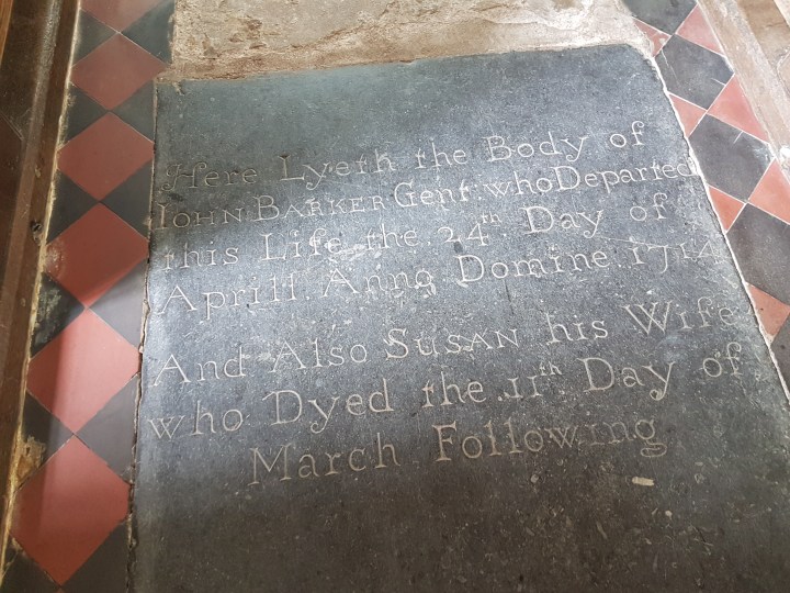 A look inside the church revealed a second mystery. Prominent in the floor of the aisle is the black gravestone of John Barker, who died in 1714, and his wife Susan. Apparently, the term “Gent” denotes Gentleman, a person of good reputation. I haven’t yet found a direct connection to our ancestry.