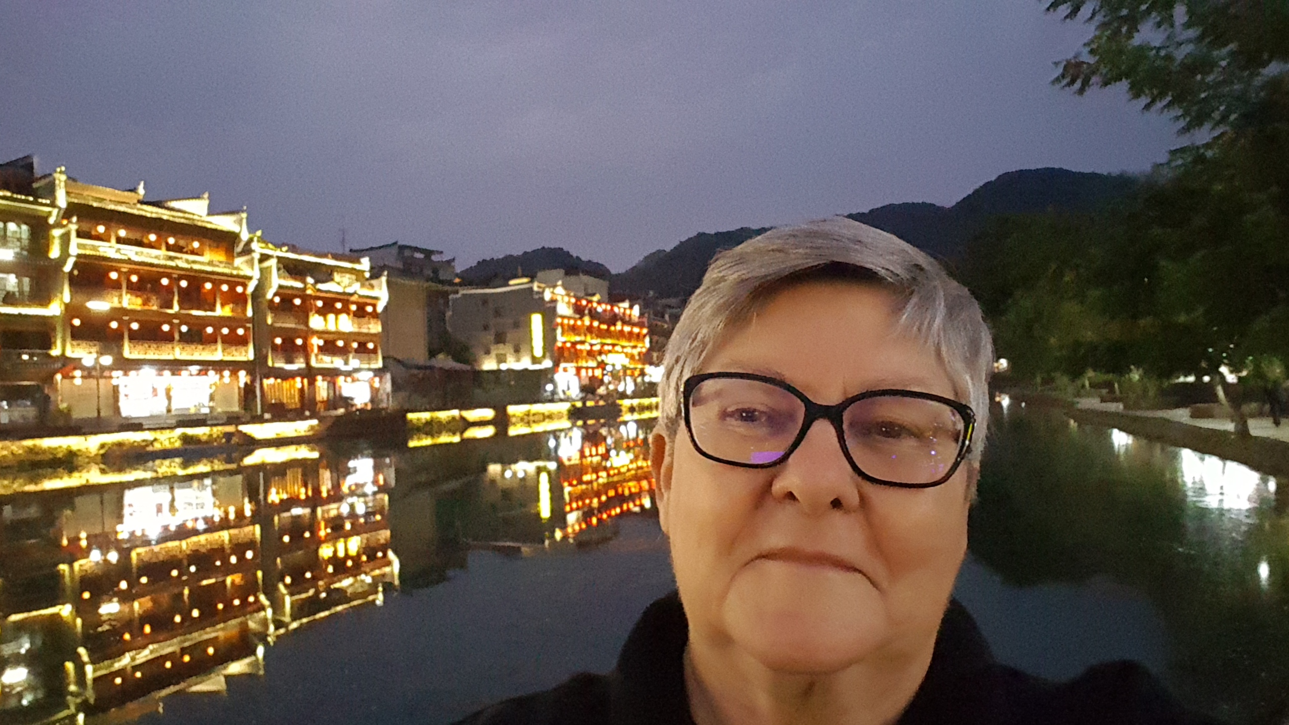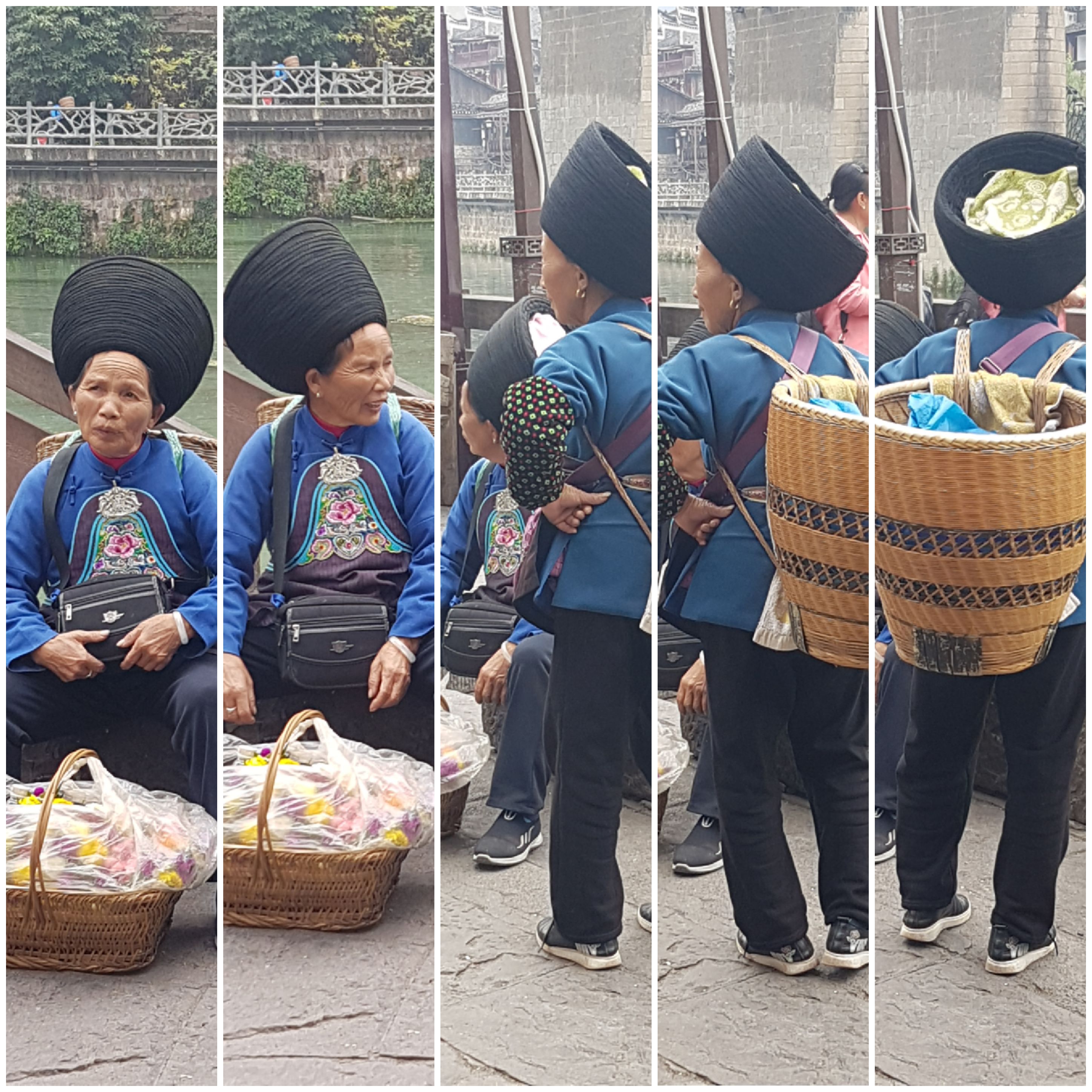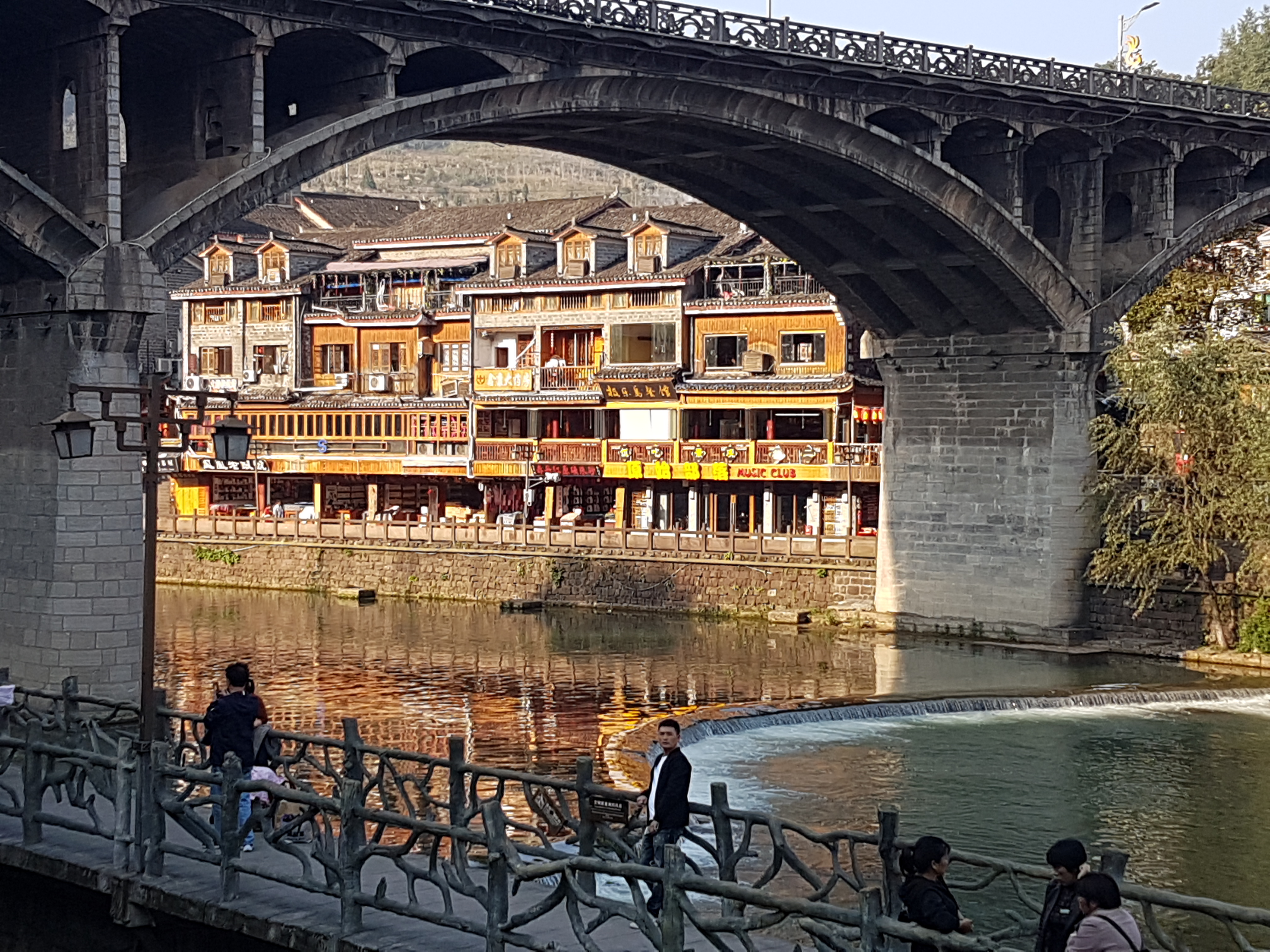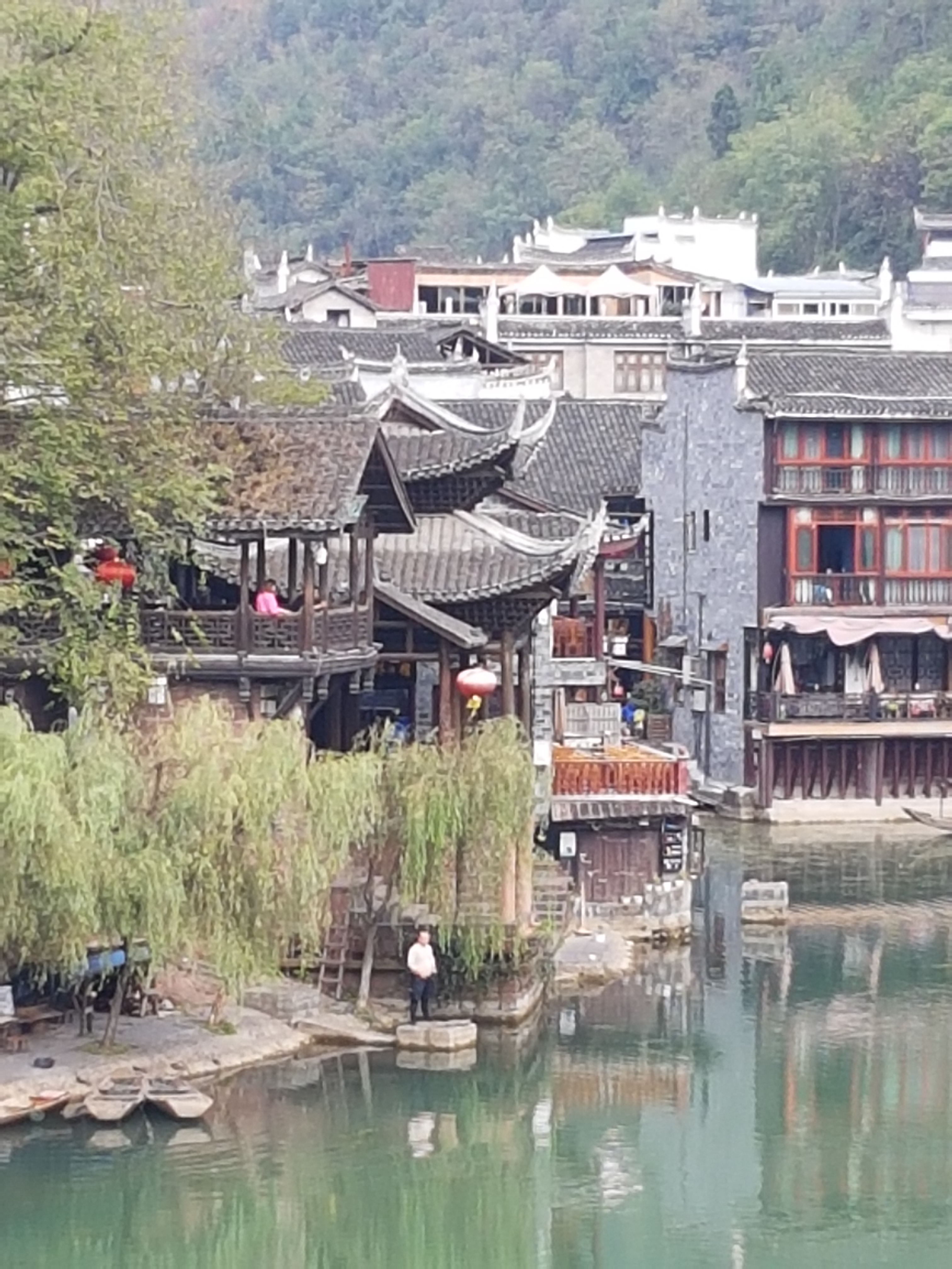 Fenghuang is a famous ancient watertown that has called to me for years. Pictures of this ancient town are used on many, many promotions of tourism in China. I finally answered the call, and I am so glad. Strangely, for being so famous, it is not so easy to get to – no train station. So a series of buses and taxis took me to and from, and that was made easier by the help of so many, many kind and helpful people. A charming ex-soldier on the train sweetly delivered me and my heavy suitcase into the hands of an exuberant lady taxi driver who made certain I had the right bus ticket and was on the proper bus before leaving me. This happens to me all the time in China.