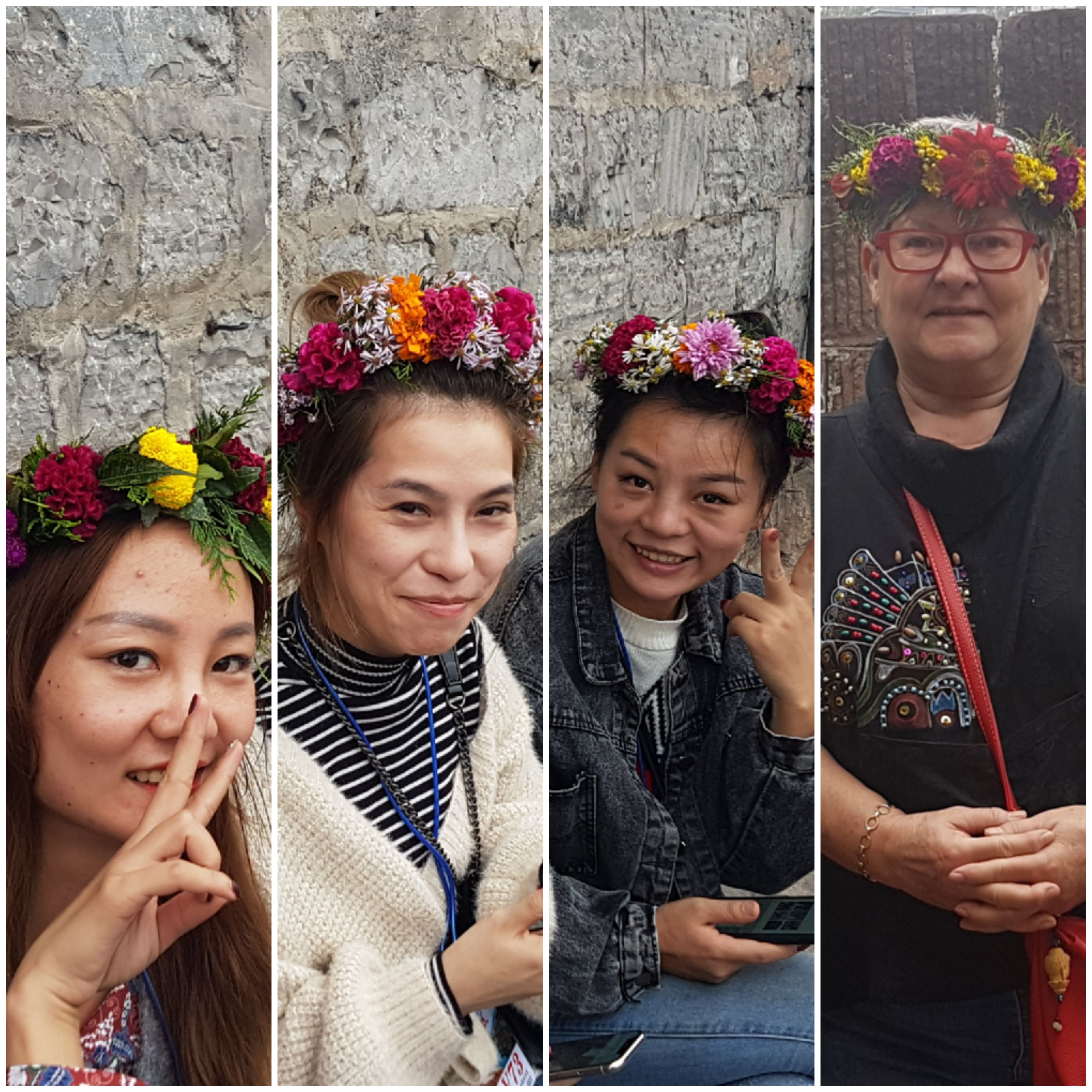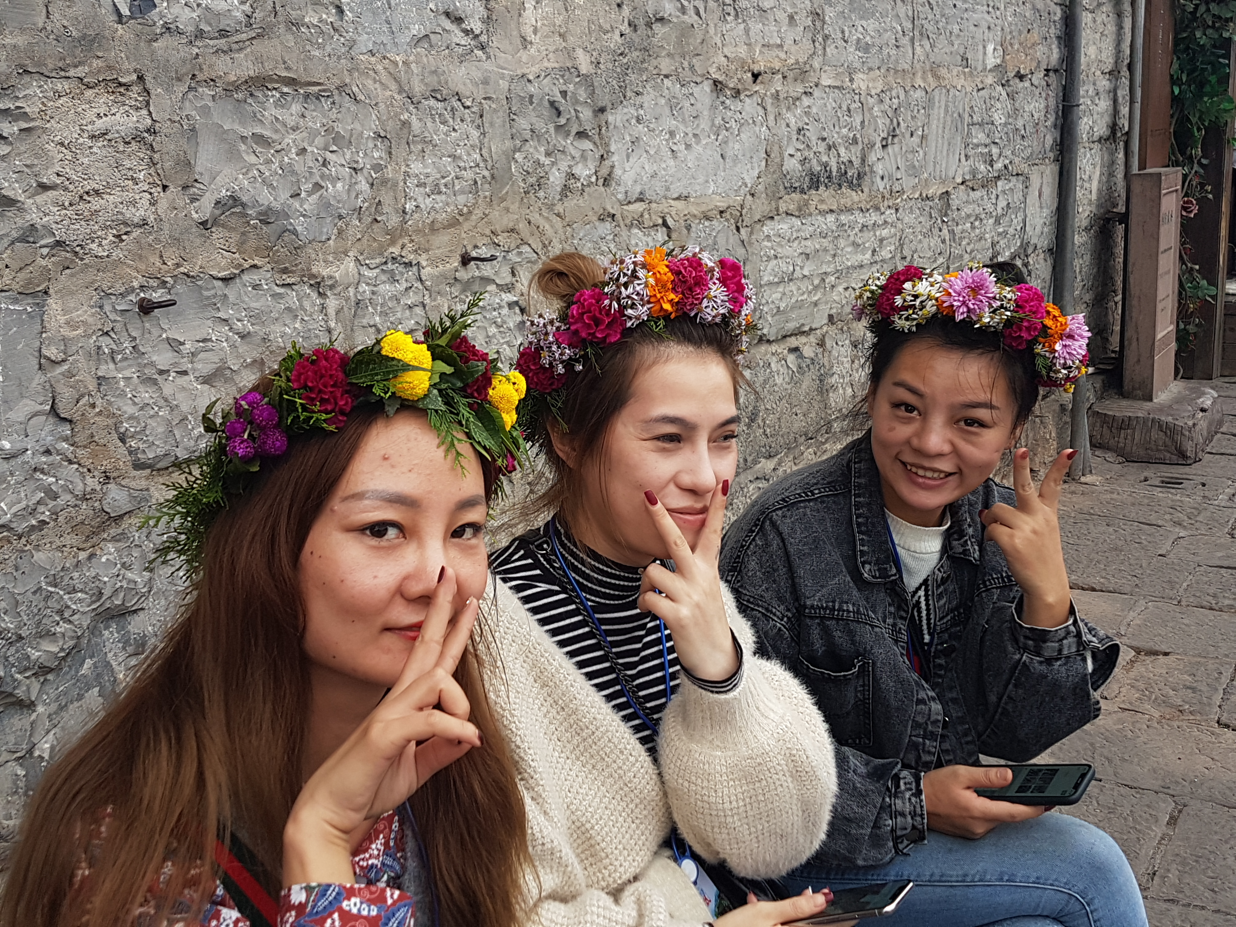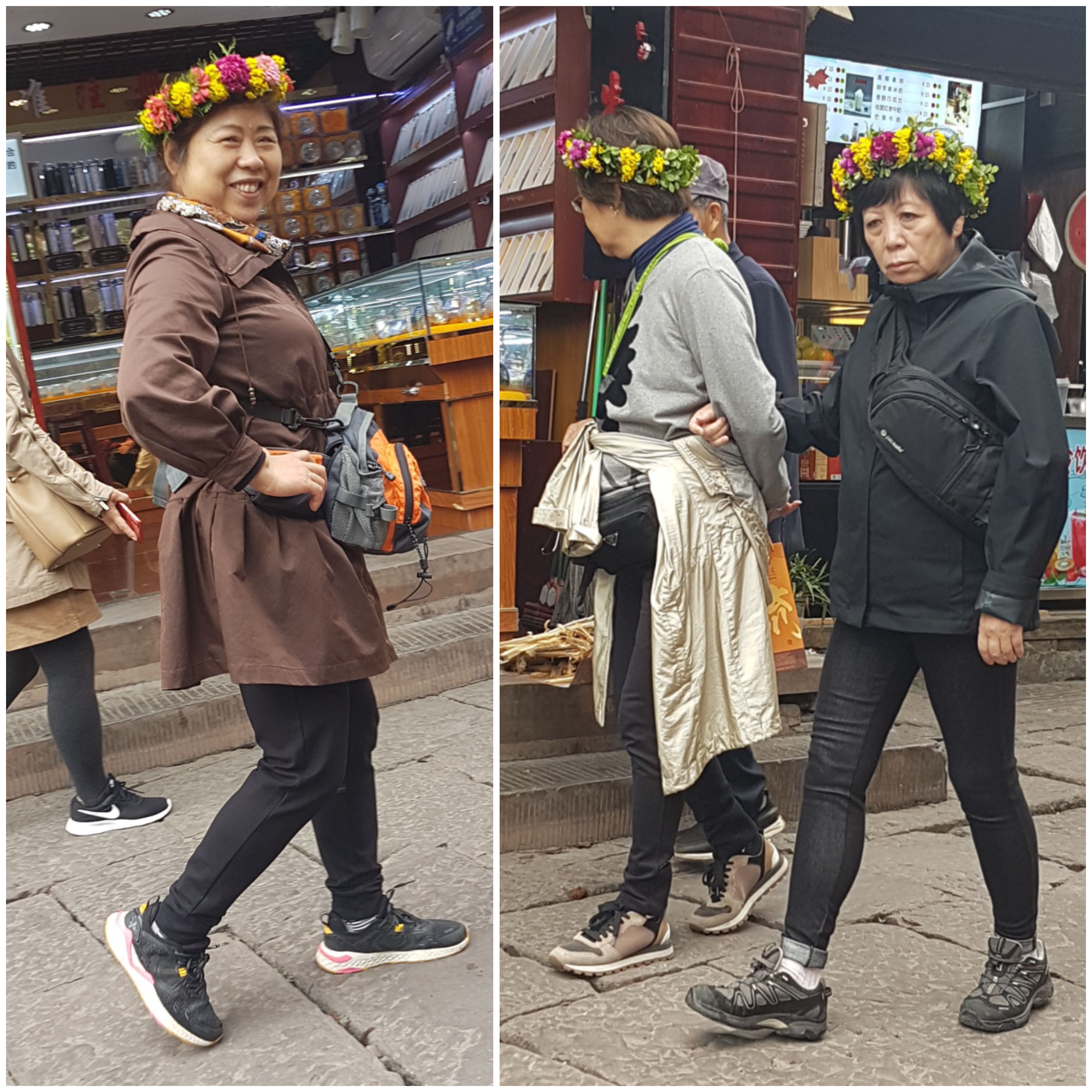 Everywhere in the old town, women wear wreaths of fresh flowers.